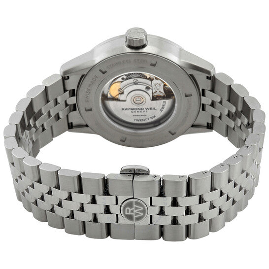 علبة وسوار من الفولاذ المقاوم للصدأ فضي اللون. إطار ثابت من الفولاذ المقاوم للصدأ فضي اللون. ميناء فضي اللون مع عقارب فضية اللون وعلامات ساعات بأرقام عربية. علامات دقائق بأرقام عربية (بفاصل 5 دقائق). نوع الميناء: تناظري. عرض التاريخ عند موضع الساعة 3. حركة أوتوماتيكية. زجاج ياقوتي مقاوم للخدش. علبة دائرية الشكل، مقاسها: 42.5 مم. مشبك قابل للطي مع مفتاح أمان. مقاومة للماء حتى عمق 50 مترًا / 165 قدمًا. الوظائف: التاريخ، الساعة، الدقائق، الثواني. سلسلة فريلانسر. طراز ساعة رسمية. علامة الساعة: صناعة سويسرية. ساعة ريموند ويل فريلانسر أوتوماتيكية للرجال بمينا فضي، 2734-ST-05650.