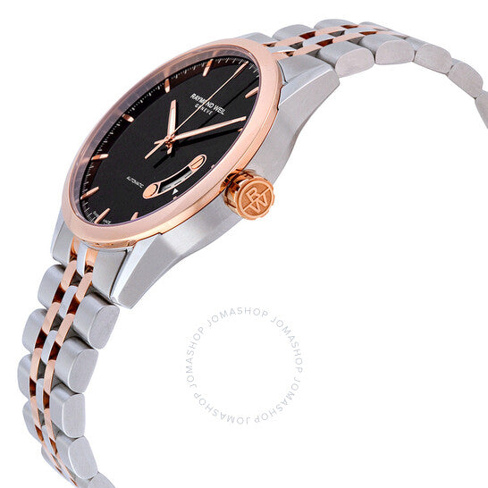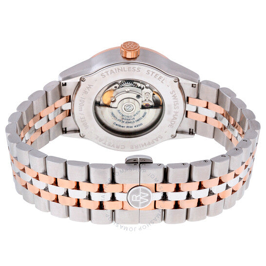علبة من الفولاذ المقاوم للصدأ مع سوار من الفولاذ المقاوم للصدأ ثنائي اللون (فضي وذهبي وردي مطلي بتقنية PVD). إطار ثابت مطلي بتقنية PVD من الذهب الوردي. ميناء أسود مع عقارب مضيئة وعلامات ساعات ذهبية وردية. علامات دقائق حول الحافة الخارجية. نوع الميناء: تناظري. عقارب وعلامات مضيئة. عرض التاريخ عند موضع الساعة الرابعة. حركة أوتوماتيكية مع احتياطي طاقة لمدة 38 ساعة. زجاج من الياقوت المقاوم للخدش. تاج قابل للسحب/الدفع. غطاء خلفي هيكلي. قطر العلبة: 42 مم. سمكها: 10.2 مم. شكلها دائري. عرض السوار: 20.3 مم. طول السوار: 8 بوصات. مشبك قابل للطي. مقاومة للماء حتى عمق 100 متر / 330 قدمًا. الوظائف: التاريخ، الساعة، الدقائق، الثواني. طراز ساعة رسمية. علامة الساعة: صناعة سويسرية. إصدارات المنتج: RW 2730 SP5 20011، RW.2730.SP5.20011، RW2730SP520011. ساعة ريموند ويل فريلانسر للرجال، بمينا أسود ودرجتي لون، 2730-SP5-20011.