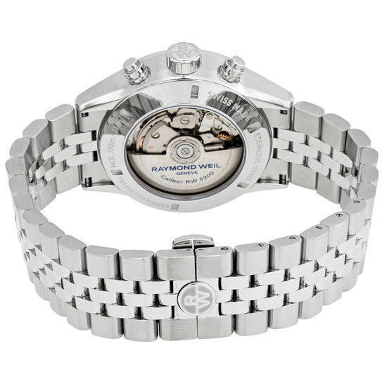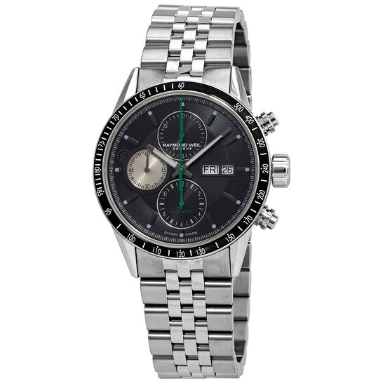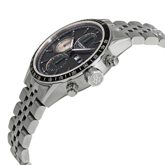 علبة من الفولاذ المقاوم للصدأ مع سوار من الفولاذ المقاوم للصدأ. إطار ثابت من الفولاذ المقاوم للصدأ مع حلقة علوية سوداء مطلية بتقنية PVD تُظهر علامات مقياس سرعة الدوران. ميناء أسود بعقارب رمادية مضيئة وعلامات ساعات مؤشرية. علامات دقائق حول الحافة الخارجية. نوع الميناء: تناظري. عقارب وعلامات مضيئة. عرض يوم الأسبوع والتاريخ عند موضع الساعة 3. كرونوغراف - ثلاثة أقراص فرعية تعرض: 60 ثانية و30 دقيقة و12 ساعة. حركة أوتوماتيكية من ريموند ويل، عيار RW 5000، مبنية على عيار ETA-Valjoux 7750، تحتوي على 25 جوهرة، تنبض بمعدل 28800 ذبذبة في الساعة، ولديها احتياطي طاقة لمدة 46 ساعة تقريبًا. كريستال ياقوت مقاوم للخدش. تاج لولبي. غطاء خلفي شفاف. شكل دائري. حجم العلبة: 42 مم. سمك العلبة: 13.85 مم. عرض السوار: 22 مم. مشبك قابل للطي بزر ضغط للتحرير. مقاومة للماء حتى عمق ١٠٠ متر / ٣٣٠ قدمًا. الوظائف: كرونوغراف، تاريخ، يوم، ساعة، دقيقة، ثانية، تاكيمتر. سلسلة فريلانسر. تصميم فاخر. علامة الساعة: سويسرية الصنع. ساعة ريموند ويل فريلانسر كرونوغراف أوتوماتيكية بمينا سوداء للرجال، ٧٧٣١-ST1-٢٠٣٢١.