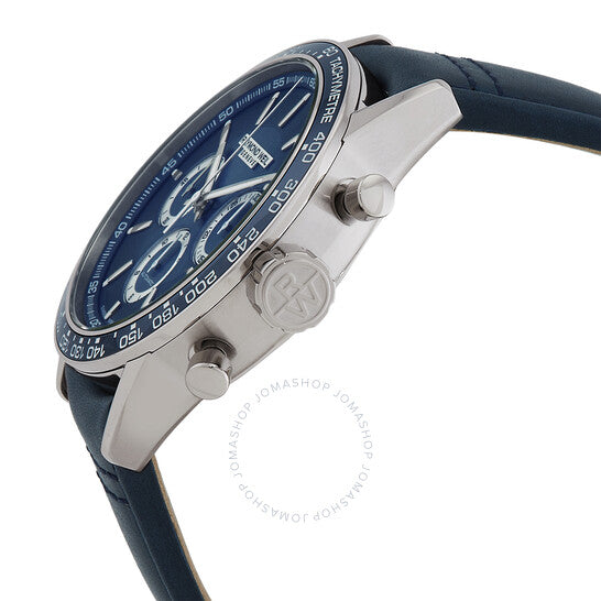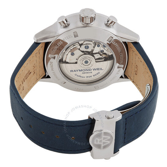 علبة من الفولاذ المقاوم للصدأ فضية اللون مع سوار جلدي أزرق. إطار من السيراميك الأزرق. ميناء أزرق مع عقارب ومؤشرات ساعات فضية اللون. مقياس سرعة الدوران حول الحافة الخارجية. نوع الميناء: تناظري. عقارب ومؤشرات مضيئة. حركة أوتوماتيكية من ريموند ويل كاليبر RW5030 مع احتياطي طاقة لمدة 56 ساعة. زجاج من الياقوت المقاوم للخدش. تاج لولبي. غطاء خلفي شفاف. شكل العلبة دائري، مقاسها: 43.5 مم، سمكها: 13.7 مم. مشبك قابل للطي مع مفتاح أمان. مقاومة للماء حتى عمق 100 متر / 330 قدم. الوظائف: كرونوغراف، ساعات، دقائق، ثوانٍ. سلسلة فريلانسر. طراز الساعة الرياضية. علامة الساعة: صناعة سويسرية. ساعة ريموند ويل فريلانسر كرونوغراف أوتوماتيكية للرجال بمينا زرقاء 7741-SC3-50021.