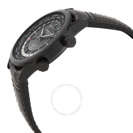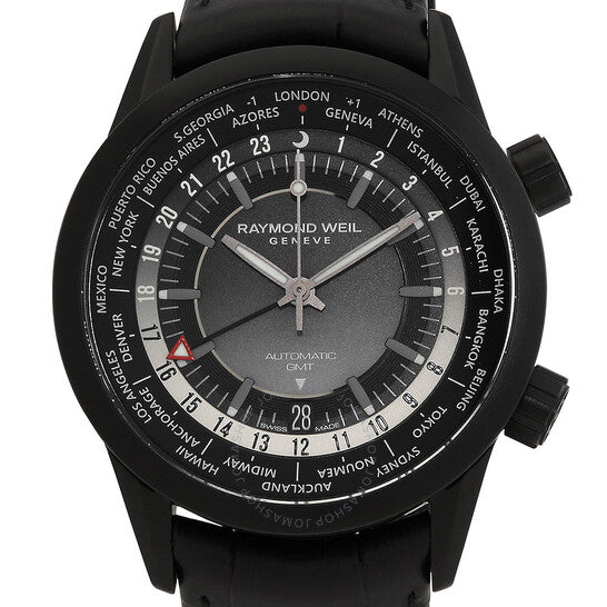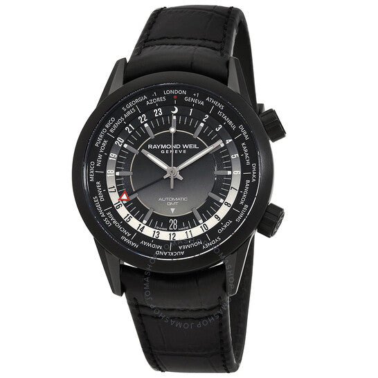 علبة من الفولاذ المقاوم للصدأ أسود مع سوار جلدي أسود. إطار ثابت من الفولاذ المقاوم للصدأ أسود. ميناء أسود بعقارب سوداء وعلامات ساعات رقمية عربية. علامات دقائق حول الحافة الخارجية. نوع الميناء: تناظري. عرض التاريخ عند موضع الساعة السادسة. حركة أوتوماتيكية. زجاج ياقوت مقاوم للخدش. تاج لولبي. غطاء خلفي شفاف. شكل العلبة دائري، مقاسها: 40.5 مم. إبزيم قابل للطي بزر ضغط. مقاومة للماء حتى عمق 100 متر / 330 قدمًا. الوظائف: التاريخ، توقيت غرينتش، المنطقة الزمنية الثانية، الساعات، الدقائق، الثواني. سلسلة فريلانسر. تصميم كاجوال. علامة الساعة: صناعة سويسرية. ساعة ريموند ويل فريلانسر جي إم تي أوتوماتيكية للرجال بمينا أسود، 2765-BKC-20001.