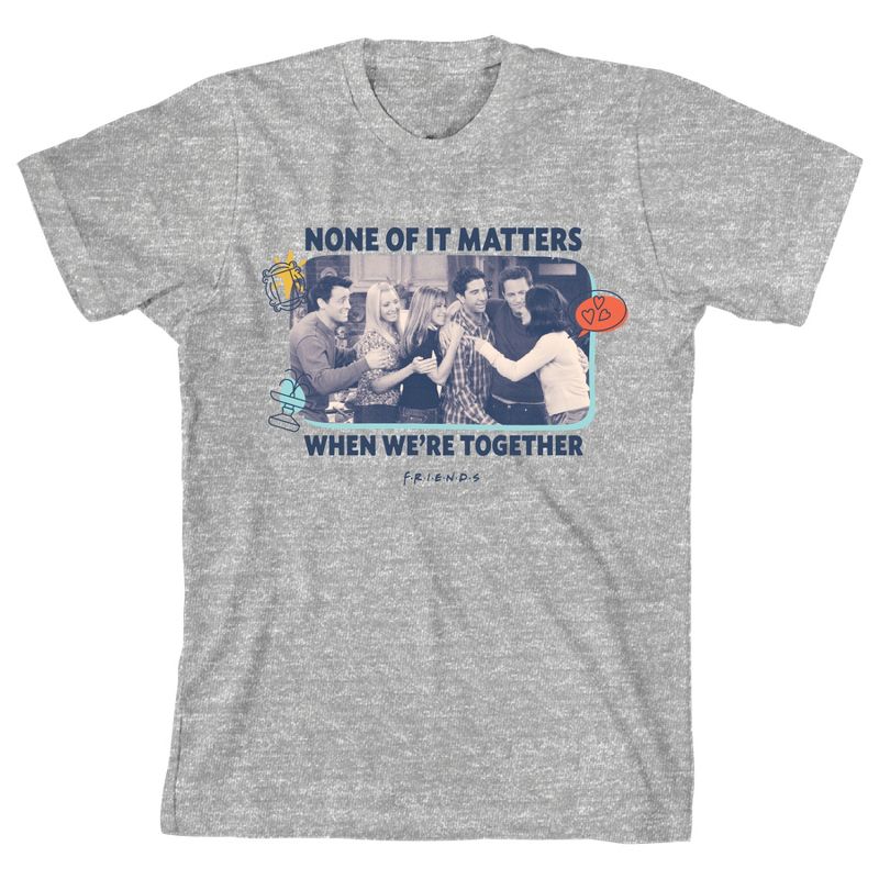- تيشيرت برسومات جرافيكية: صورة بالأبيض والأسود لجوي وبقية طاقم مسلسل "فريندز" تزين هذا التيشيرت الجرافيكي، بينما كُتب حول الصورة بحروف زرقاء داكنة: "لا يهم ما دام كل هذا معًا". سيُعجب مُحبو المسلسل التلفزيوني بهذا التصميم.