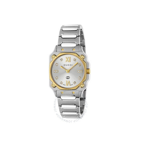 علبة وسوار من الفولاذ المقاوم للصدأ فضي اللون. إطار ثابت من الفولاذ المقاوم للصدأ بلون ذهبي أصفر. ميناء فضي اللون مع عقارب ذهبية اللون وعلامات ساعات من الألماس. نوع الميناء: تناظري. عقارب مضيئة. آلية حركة كوارتز. زجاج ياقوت مقاوم للخدش. غطاء خلفي صلب. شكل العلبة مربع، مقاسها: ٢٤ مم. مشبك قابل للطي مع قفل أمان. مقاومة للماء حتى عمق ٥٠ مترًا / ١٦٥ قدمًا. الوظائف: الساعات، الدقائق. سلسلة G-flat. تصميم ساعة كاجوال. علامة الساعة: صناعة سويسرية. ساعة غوتشي G-flat كوارتز نسائية بمينا فضي مرصعة بالألماس، YA166503.