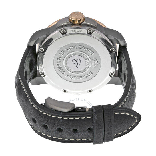 علبة تيتانيوم رمادية اللون مع سوار جلدي أسود (جلد العجل الباريني). إطار ثابت من الذهب الوردي مع حلقة من الألومنيوم الأسود. ميناء رمادي اللون مع عقارب مضيئة من الذهب الوردي ومؤشرات ساعات رقمية عربية صغيرة. تشير الأرقام العربية إلى موضعي الساعة 6 و12. علامات دقائق حول الحافة الخارجية. نوع الميناء: تناظري. عقارب ومؤشرات مضيئة. عرض التاريخ عند موضع الساعة 3. حركة أوتوماتيكية ETA Caliber A07.111، مبنية على ETA 7750، تحتوي على 24 جوهرة، تنبض بمعدل 28800 ذبذبة في الساعة، ولديها احتياطي طاقة لمدة 48 ساعة تقريبًا. زجاج ياقوت مقاوم للخدش. تاج لولبي. غطاء خلفي صلب. شكل دائري، مقاس العلبة: 44.5 مم، سمك العلبة: 13.9 مم. عرض السوار: 20 مم. مشبك قابل للطي. مقاومة للماء حتى عمق 100 متر / 330 قدمًا. الوظائف: التاريخ، الساعة، الدقيقة، الثانية، الكرونومتر. سلسلة جائزة موناكو الكبرى التاريخية. تصميم ساعة فاخر. علامة الساعة: صناعة سويسرية. إصدارات الساعة: 168568 9001، 168568.9001، 1685689001. ساعة شوبارد GPMH للرجال بمينا رمادي وجلد أسود، 168568-9001.