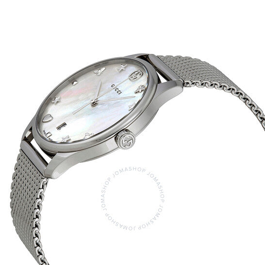 علبة من الفولاذ المقاوم للصدأ مع سوار شبكي من الفولاذ المقاوم للصدأ. إطار ثابت من الفولاذ المقاوم للصدأ. ميناء من عرق اللؤلؤ مع عقارب فضية اللون وعلامات ساعات. نوع الميناء: تناظري. عرض التاريخ أعلى موضع الساعة السادسة. حركة كوارتز. زجاج ياقوت مقاوم للخدش. تاج قابل للسحب/الدفع. غطاء خلفي صلب. شكل دائري. حجم العلبة: 36 مم. عرض السوار: 20 مم. مشبك قابل للطي. مقاومة للماء حتى عمق 50 مترًا / 165 قدمًا. الوظائف: التاريخ، الساعات، الدقائق، الثواني. معلومات إضافية: مزينة بعلامات غوتشي المميزة: النحلة، النجمة، المثلث، والقلب. تصميم ساعة رسمية. علامة الساعة: صناعة سويسرية. ساعة غوتشي جي-تايملس النسائية بمينا من عرق اللؤلؤ YA1264040.