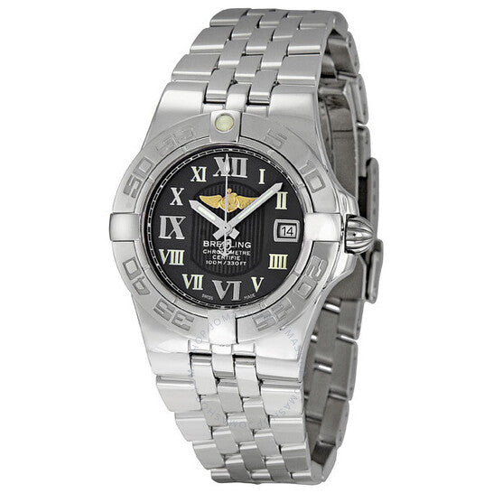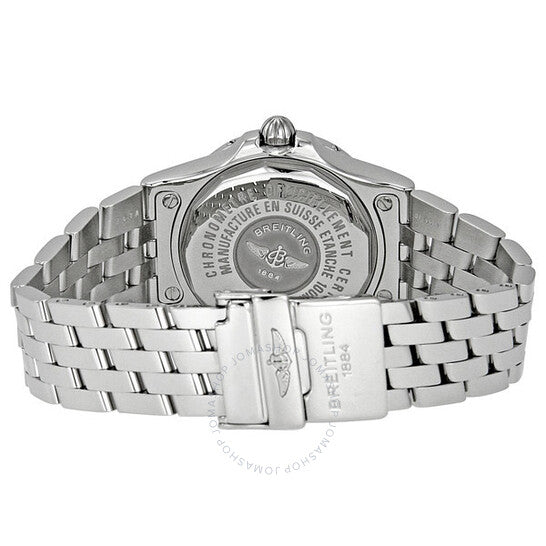 علبة من الفولاذ المقاوم للصدأ مع سوار من الفولاذ المقاوم للصدأ. إطار أحادي الاتجاه من الفولاذ المقاوم للصدأ بسقاطة. ميناء أسود مع عقارب فضية مضيئة وعلامات ساعات بأرقام رومانية. علامات دقائق حول الحافة الخارجية. عقارب وعلامات مضيئة. يظهر عرض التاريخ عند موضع الساعة 3. آلية حركة سوبر كوارتز. تاج بدون براغي بثلاث حشوات. غطاء خلفي صلب مثبت ببراغي. قطر العلبة: 30 مم. سُمكها: 12.2 مم. مقاومة للماء حتى عمق 100 متر / 330 قدمًا. ساعة بريتلينغ جالاكتيك 30 النسائية من الفولاذ المقاوم للصدأ A71340L2-M523SS