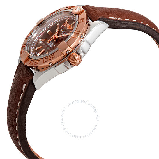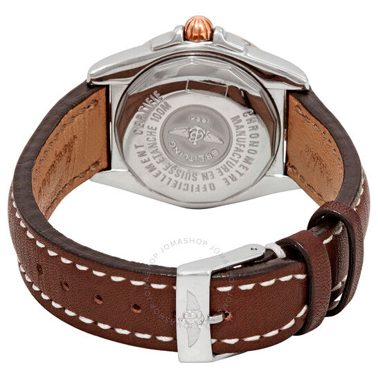 علبة من الفولاذ المقاوم للصدأ مع سوار جلدي بني. إطار دوار أحادي الاتجاه من الذهب الوردي عيار 18 قيراطًا. ميناء برونزي مع عقارب مضيئة ومؤشرات ساعات من الذهب الوردي. مؤشرات دقائق حول الحافة الخارجية. نوع الميناء: تناظري. عقارب ومؤشرات مضيئة. عرض التاريخ عند موضع الساعة 3. حركة كوارتز بريتلينغ كاليبر 71. زجاج ياقوت مقاوم للخدش. تاج مُغلق ببرغي. غطاء خلفي صلب. شكل دائري. حجم العلبة: 32 مم. سمكها: 12.70 مم. عرض السوار: 16 مم. مشبك تانغ. مقاومة للماء حتى عمق 100 متر / 330 قدمًا. الوظائف: التاريخ، الساعات، الدقائق، الثواني، الكرونومتر. تصميم ساعة فاخرة. علامة الساعة: صناعة سويسرية. ساعة بريتلينغ جالاكتيك 32 كرونومتر نسائية بمينا برونزي، C71356L2/Q581.
