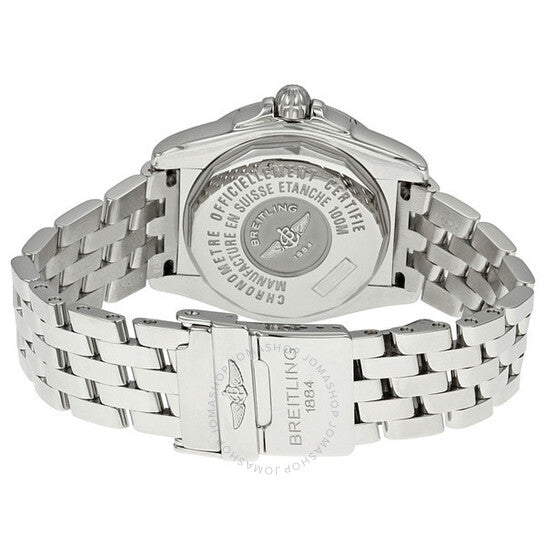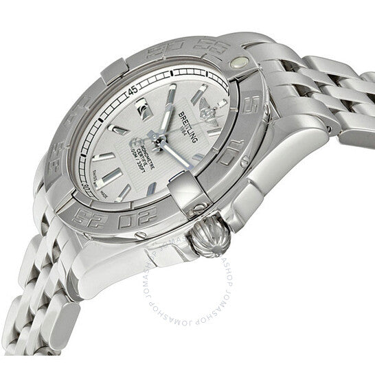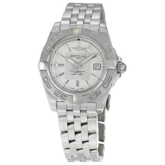 علبة من الفولاذ المقاوم للصدأ مع سوار من الفولاذ المقاوم للصدأ. إطار دوار أحادي الاتجاه من الفولاذ المقاوم للصدأ. ميناء فضي بعقارب مضيئة وعلامات ساعات. علامات دقائق حول الحافة الخارجية. يظهر عرض التاريخ عند موضع الساعة 3. حركة كوارتز. زجاج ياقوتي مقاوم للخدش. غطاء خلفي صلب. قطر العلبة: 31.8 مم. سُمكها: 12.70 مم. مشبك قابل للطي بقفل مزدوج. مقاومة للماء حتى عمق 100 متر/330 قدمًا. الوظائف: الساعات، الدقائق، الثواني، التاريخ. ساعة بريتلينغ جالاكتيك 32 النسائية بمينا فضي A71356L2-G702SS.