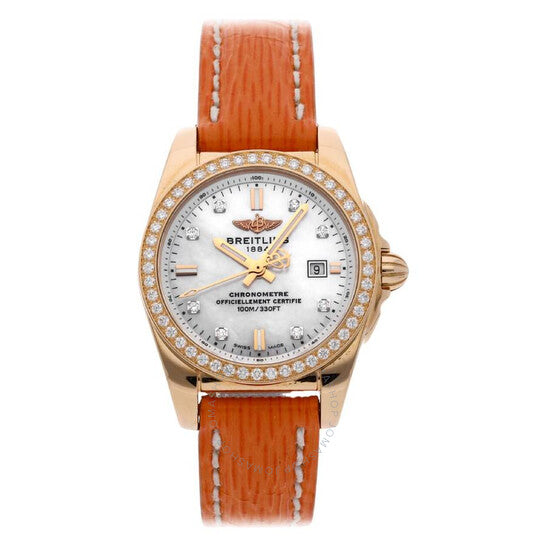 علبة من الذهب الوردي عيار ١٨ قيراطًا مع سوار جلدي برتقالي. إطار ثابت من الذهب الوردي عيار ١٨ قيراطًا مرصع بالألماس. ميناء أبيض من عرق اللؤلؤ مع عقارب بلون الذهب الوردي وعلامات ساعات مرصعة بالألماس. علامات دقائق حول الحافة الخارجية. نوع الميناء: تناظري. عرض التاريخ عند موضع الساعة ٣. حركة كوارتز بريتلينغ كاليبر ٧٢. زجاج ياقوت مقاوم للخدش. غطاء خلفي صلب. شكل العلبة دائري، مقاسها ٢٩ مم. مشبك بإبزيم. مقاومة للماء حتى عمق ١٠٠ متر / ٣٣٠ قدمًا. الوظائف: التاريخ، الساعة، الدقيقة، الثانية، الكرونومتر. سلسلة جالاكتيك. تصميم ساعة فاخرة. علامة الساعة: صناعة سويسرية. ساعة بريتلينغ جالاكتيك كوارتز كرونومتر نسائية مرصعة بالألماس H7234853/A792.