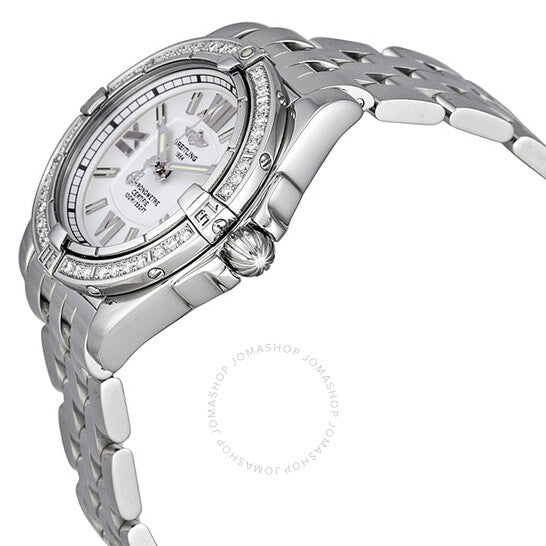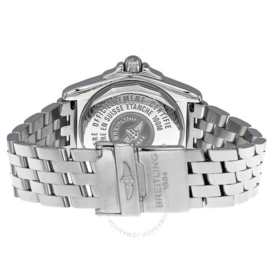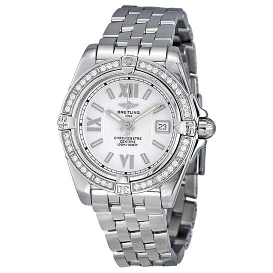 علبة من الفولاذ المقاوم للصدأ مع سوار من الفولاذ المقاوم للصدأ. إطار ثابت من الفولاذ المقاوم للصدأ مرصع بالألماس. ميناء فضي مع عقارب مضيئة بلون فضي ومؤشرات ساعات. أرقام رومانية تُشير إلى مواقع الساعات 6 و9 و12. مؤشرات دقائق حول الحافة الخارجية. نوع الميناء: تناظري. عقارب ومؤشرات مضيئة. عرض التاريخ عند موضع الساعة 3. حركة كوارتز بريتلينغ كاليبر 71. كريستال ياقوت مقاوم للخدش. تاج قابل للسحب/الدفع. غطاء خلفي صلب. حجم العلبة: 31.80 مم. سُمكها: 12.30 مم. شكلها دائري. مشبك قابل للطي. مقاومة للماء حتى عمق 100 متر / 330 قدمًا. الوظائف: التاريخ، الساعة، الدقيقة، الثانية. تصميم ساعة فاخرة. علامة الساعة: صناعة سويسرية. ساعة بريتلينغ جالاكتيك النسائية بمينا فضي ومرصعة بالألماس A7135653-G649SS.