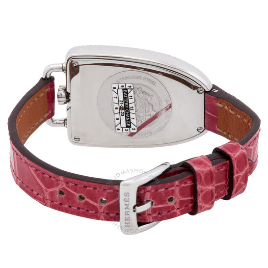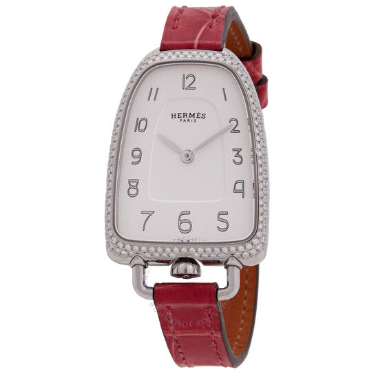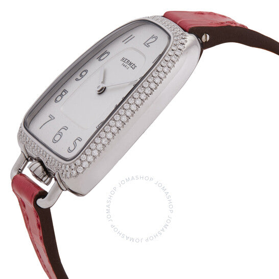 علبة من الفولاذ المقاوم للصدأ فضية اللون مع سوار جلدي بلون التوت. إطار ثابت مرصع بالألماس، مرصع بـ 150 ماسة (0.66 قيراط). ميناء فضي بعقارب فضية اللون وعلامات ساعات بأرقام عربية. نوع الميناء: تناظري. حركة كوارتز. زجاج ياقوت مقاوم للخدش. تاج قابل للسحب/الدفع. غطاء خلفي صلب. شكل فريد للعلبة، أبعادها: 40.8 مم × 26 مم. مشبك بإبزيم. مقاومة للماء حتى عمق 30 مترًا / 100 قدم. الوظائف: الساعات، الدقائق. سلسلة جالوب. طراز ساعة رسمية. علامة الساعة: صناعة سويسرية. ساعة هيرمس جالوب كوارتز نسائية بمينا فضي مرصعة بالألماس، 047885WW00.