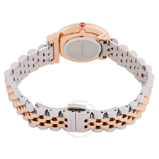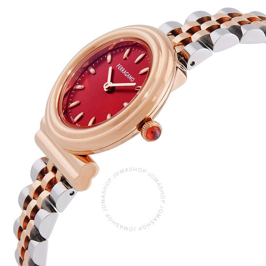 علبة من الفولاذ المقاوم للصدأ بلون الذهب الوردي، مع سوار من الفولاذ المقاوم للصدأ بلونين (فضي وذهبي وردي). إطار ثابت من الفولاذ المقاوم للصدأ بلون الذهب الوردي. ميناء أحمر مع عقارب وعلامات ساعات باللون الذهبي الوردي. علامات دقائق حول الحافة الخارجية. نوع الميناء: تناظري. حركة كوارتز. زجاج ياقوتي مقاوم للخدش. تاج قابل للسحب/الدفع. غطاء خلفي صلب. شكل دائري، مقاس العلبة: ٢٨ مم. إبزيم قابل للطي بزر ضغط. مقاومة للماء حتى عمق ٣٠ مترًا / ١٠٠ قدم. الوظائف: ساعة، دقيقة. سلسلة غانشيني. طراز ساعة رسمية. علامة الساعة: صناعة سويسرية. ساعة فيراغامو غانشيني كوارتز نسائية بمينا حمراء ثنائية اللون SFMV01323.