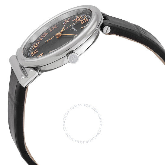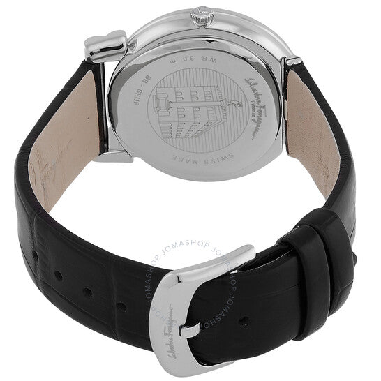 علبة من الفولاذ المقاوم للصدأ فضية اللون مع سوار جلدي أسود. إطار ثابت من الفولاذ المقاوم للصدأ فضي اللون. ميناء أسود بعقارب ذهبية اللون وعلامات ساعات بأرقام رومانية. نوع الميناء: تناظري. حركة كوارتز. زجاج ياقوت مقاوم للخدش. تاج قابل للسحب/الدفع. غطاء خلفي صلب. شكل دائري، مقاس العلبة: 34 مم، سمكها: 7.4 مم. عرض السوار: 18 مم. مشبك بإبزيم. مقاومة للماء حتى عمق 30 مترًا / 100 قدم. الوظائف: الساعات، الدقائق، الثواني. سلسلة جانشينو. تصميم كاجوال. علامة الساعة: صناعة سويسرية. ساعة فيراغامو جانشينو كوارتز نسائية بمينا سوداء SFUF00621.
