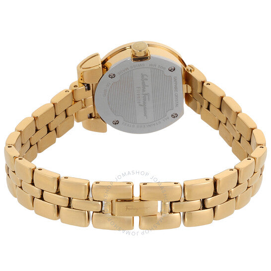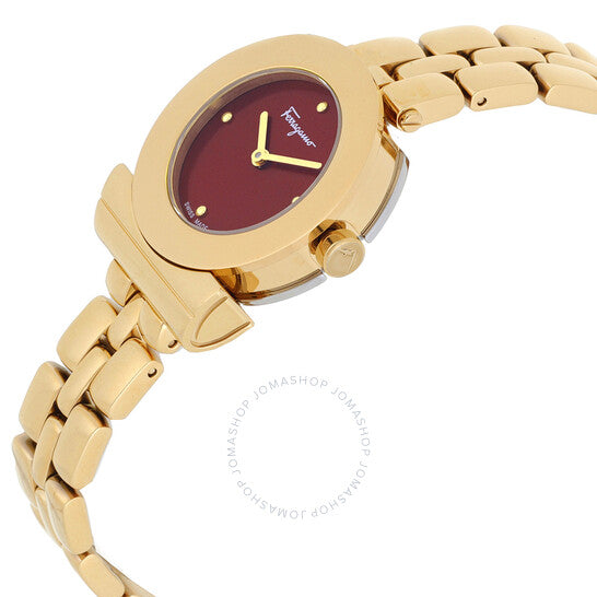 علبة وسوار من الفولاذ المقاوم للصدأ ذهبي اللون. إطار ثابت من الفولاذ المقاوم للصدأ ذهبي اللون. ميناء أحمر بعقارب ذهبية اللون وعلامات ساعات منقطة. نوع الميناء: تناظري. حركة كوارتز. زجاج ياقوت مقاوم للخدش. تاج قابل للسحب/الدفع. غطاء خلفي صلب. شكل دائري، مقاس العلبة: ٢٧ مم. مشبك مجوهرات. مقاومة للماء حتى عمق ٥٠ مترًا / ١٦٥ قدمًا. الوظائف: الساعات، الدقائق. سلسلة جانشينو. طراز ساعة رسمية. علامة الساعة: صناعة سويسرية. ساعة فيراغامو جانشينو كوارتز نسائية بمينا حمراء SFPD02424.