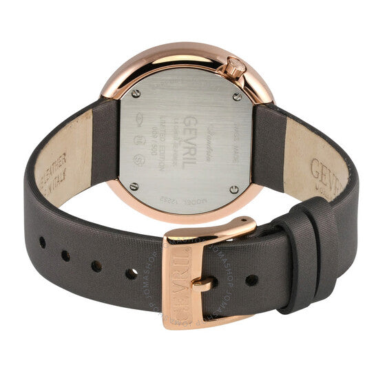 علبة من الفولاذ المقاوم للصدأ بلون الذهب الوردي مع سوار جلدي رمادي. إطار ثابت من الفولاذ المقاوم للصدأ بلون الذهب الوردي. ميناء من عرق اللؤلؤ مع عقارب بلون الذهب الوردي وعلامات ساعات بأرقام رومانية. نوع الميناء: تناظري. حركة كوارتز روندا كاليبر 762. زجاج ياقوت مقاوم للخدش. تاج قابل للسحب/الدفع. غطاء خلفي صلب. شكل دائري، مقاس العلبة: 36 مم، سمكها: 7.5 مم. عرض السوار: 16 مم. مشبك بإبزيم. مقاومة للماء حتى عمق 50 مترًا / 165 قدمًا. الوظائف: الساعات، الدقائق. معلومات إضافية: 108 ماسات مزروعة على العلبة الخارجية. سلسلة غاندريا. تصميم ساعة فاخرة. علامة الساعة: صناعة سويسرية. ساعة جيفريل غاندريا النسائية بمينا من عرق اللؤلؤ 12252.