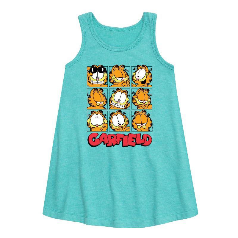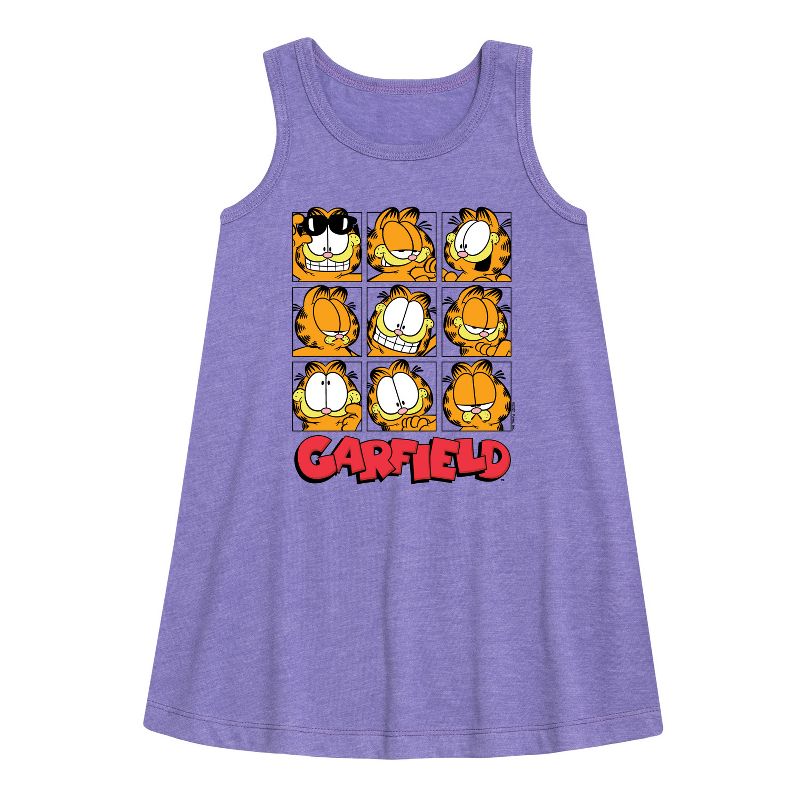 غارفيلد - شبكة الوجوه - فستان بقصة حرف A للفتيات الصغيرات والشابات - أضفِ لمسةً من الفكاهة والكسل التي تميز القط البرتقالي الشهير إلى خزانة ملابسك مع أزياء غارفيلد الجرافيكية. تتميز هذه التصاميم بشخصيات غارفيلد وأودي وجون، وتحتفل بالقصص المصورة الشهيرة وشخصياتها المحبوبة.