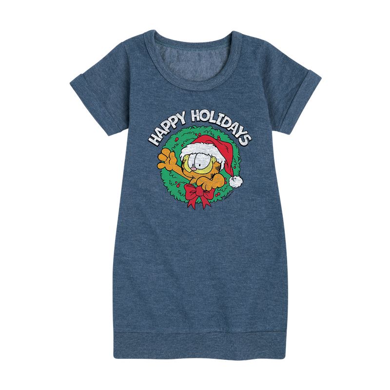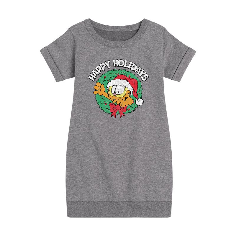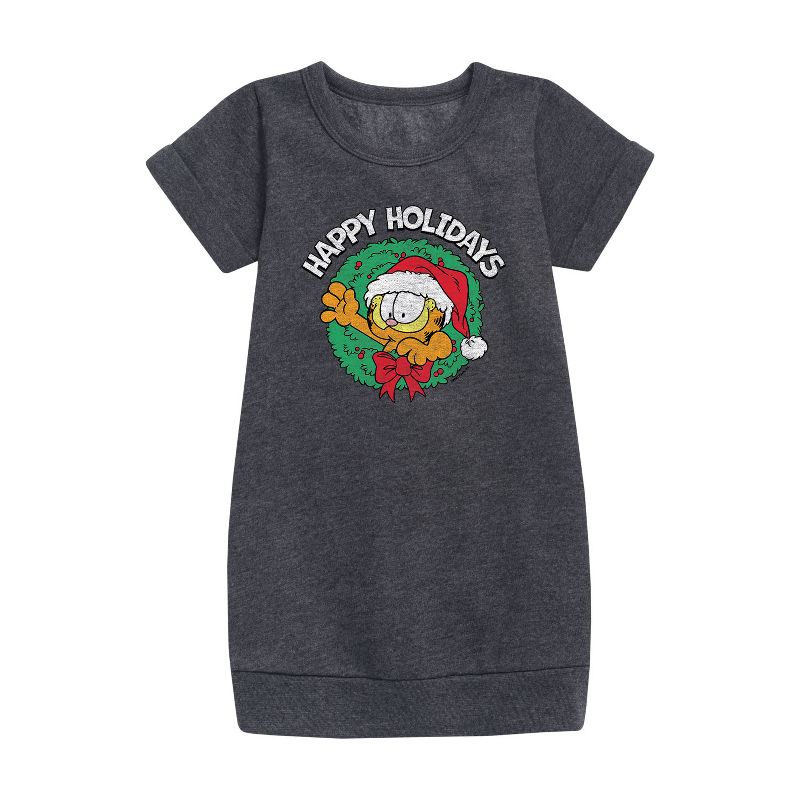 فستان غارفيلد الصوفي - إكليل أعياد سعيد - للفتيات الصغيرات والشابات - أضفِ لمسةً من الفكاهة والكسل إلى خزانة ملابسك مع ملابس غارفيلد الجرافيكية. تتميز هذه التصاميم بشخصيات غارفيلد وأودي وجون، وتحتفل بالقصص المصورة الشهيرة وشخصياتها المحبوبة.