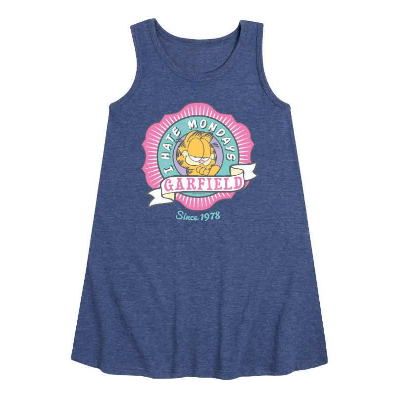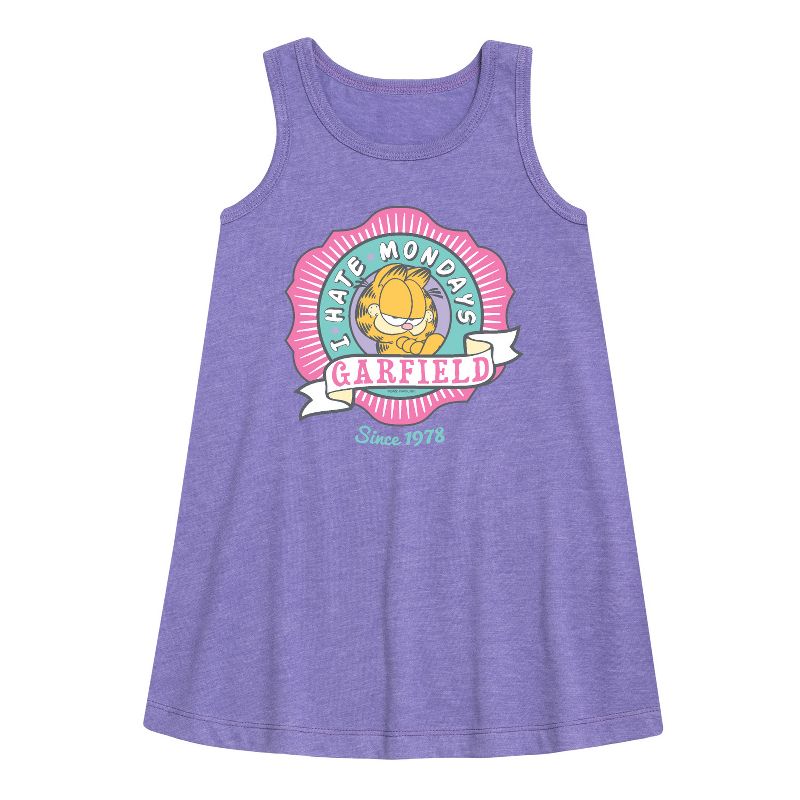 غارفيلد - شارة "أكره أيام الإثنين" - فستان بقصة حرف A للفتيات الصغيرات والشابات - أضفِ لمسةً من الفكاهة والكسل التي تميّز القط البرتقالي الشهير إلى خزانة ملابسك مع ملابس غارفيلد الجرافيكية. تُجسّد هذه التصاميم غارفيلد وأودي وجون، وتُحتفي بالقصص المصورة الشهيرة وشخصياتها المحبوبة.