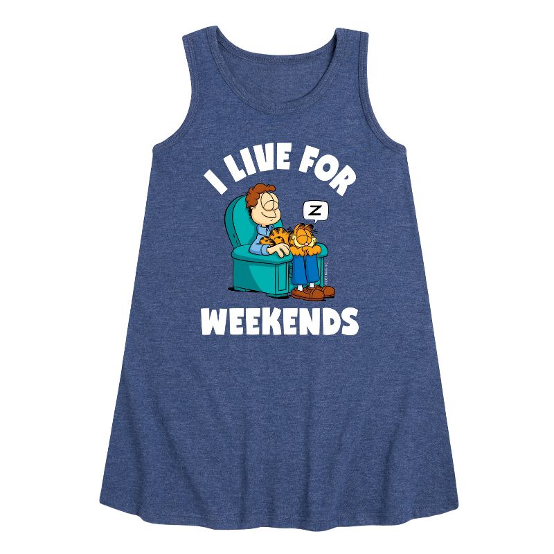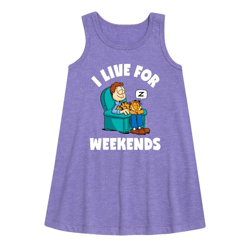 غارفيلد - أعيش لعطلات نهاية الأسبوع - فستان بقصة حرف A للفتيات الصغيرات والشابات - أضفِ لمسةً من الفكاهة والكسل التي تميز القط البرتقالي الشهير إلى خزانة ملابسك مع ملابس غارفيلد الجرافيكية. تتميز هذه التصاميم بغارفيلد وأودي وجون، وتحتفل بالقصص المصورة الشهيرة وشخصياتها المحبوبة.