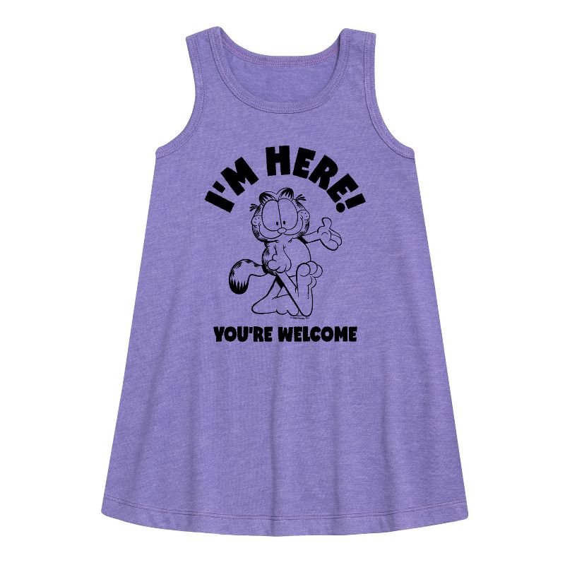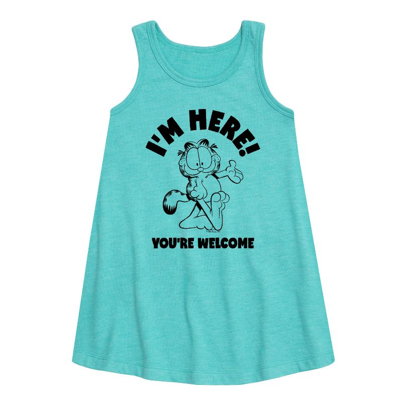 غارفيلد - أنا هنا، أهلاً وسهلاً - فستان بقصة حرف A للفتيات الصغيرات والشابات - أضفِ لمسةً من الفكاهة والكسل التي تميز القط البرتقالي الشهير إلى خزانة ملابسك مع أزياء غارفيلد الجرافيكية. تتميز هذه التصاميم بشخصيات غارفيلد وأودي وجون، وتحتفل بالقصص المصورة الشهيرة وشخصياتها المحبوبة.