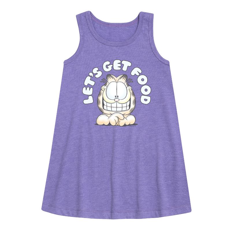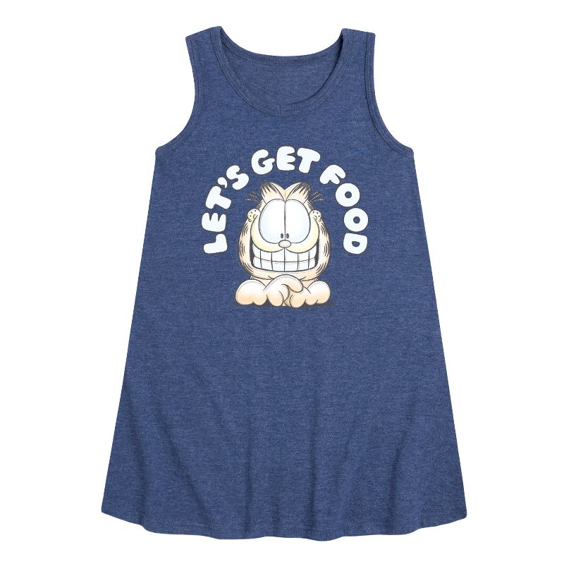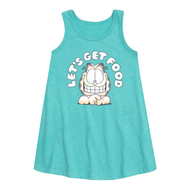غارفيلد - هيا نأكل - فستان بقصة حرف A للفتيات الصغيرات والشابات - أضفِ لمسةً من الفكاهة والكسل التي تميز القط البرتقالي الشهير إلى خزانة ملابسك مع أزياء غارفيلد الجرافيكية. تتميز هذه التصاميم بغارفيلد وأودي وجون، وتحتفل بالقصص المصورة الشهيرة وشخصياتها المحبوبة.
