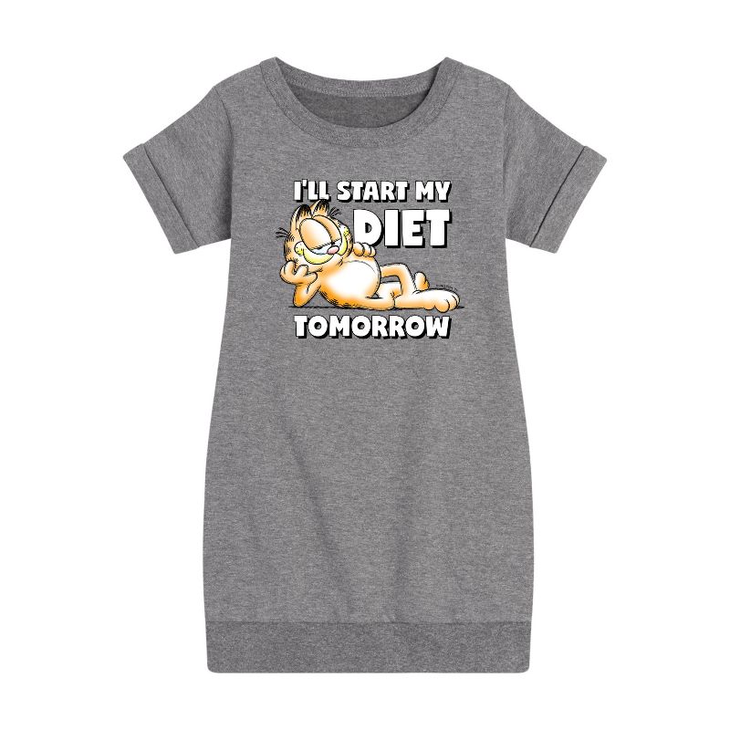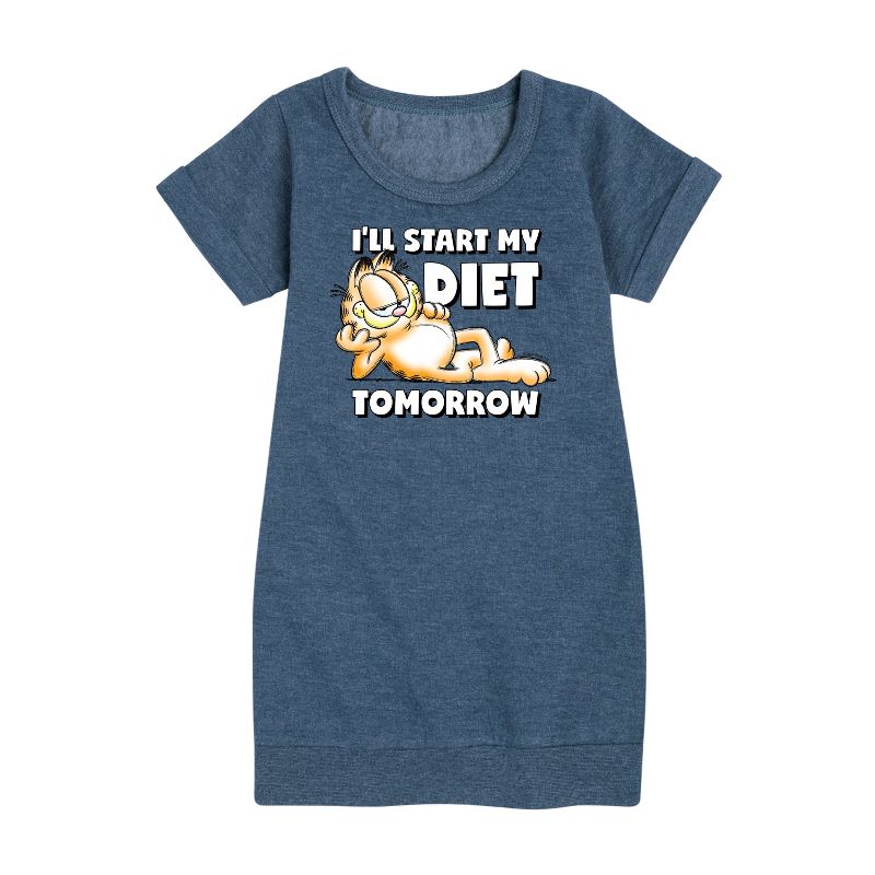 فستان غارفيلد الصوفي - ابدأ حميتي غدًا - للفتيات الصغيرات والشابات - أضفِ لمسةً من الفكاهة والكسل إلى خزانة ملابسك مع ملابس غارفيلد الجرافيكية. تتميز هذه التصاميم بشخصيات غارفيلد وأودي وجون، وتحتفل بالقصص المصورة الشهيرة وشخصياتها المحبوبة.