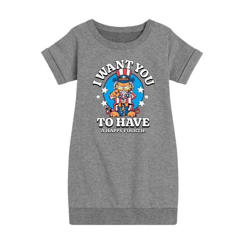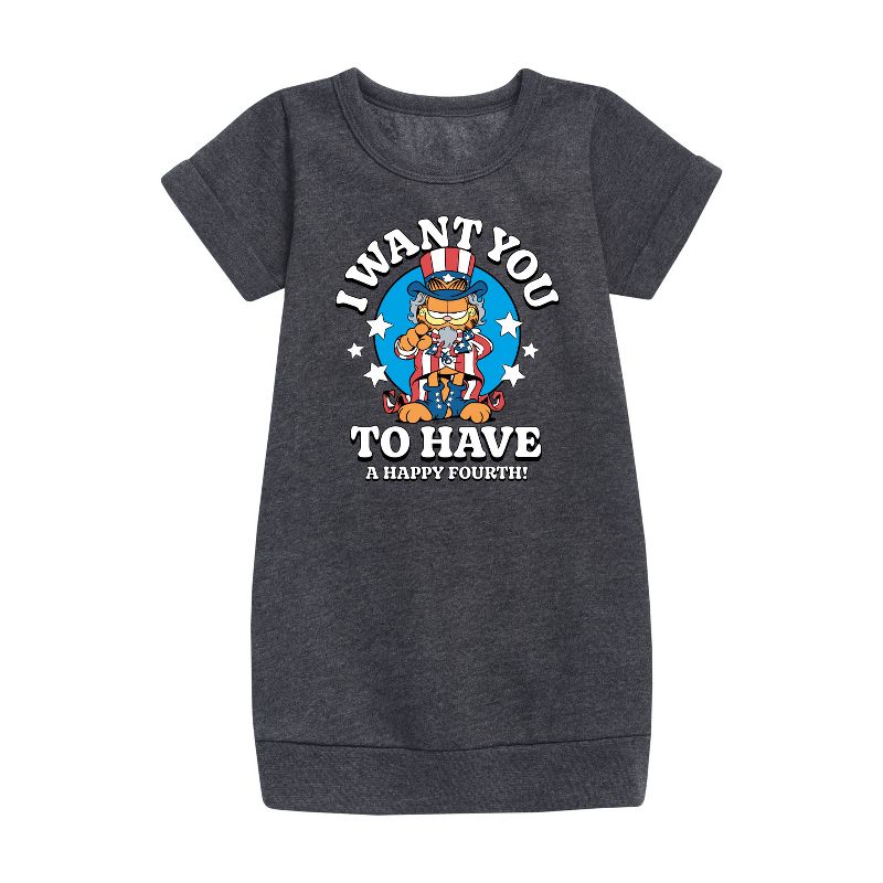 غارفيلد - أتمنى لك عيدًا رابعًا سعيدًا - فستان صوف للفتيات الصغيرات والشابات - أضفِ لمسةً من الفكاهة والكسل إلى خزانة ملابسك مع ملابس غارفيلد الجرافيكية. تتميز هذه التصاميم بغارفيلد وأودي وجون، وتحتفل بالقصص المصورة الشهيرة وشخصياتها المحبوبة.