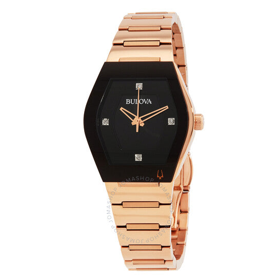 علبة وسوار من الفولاذ المقاوم للصدأ بلون الذهب الوردي. إطار ثابت من الفولاذ المقاوم للصدأ بلون الذهب الوردي. ميناء أسود بعقارب بلون الذهب الوردي وعلامات ساعات من الألماس. نوع الميناء: تناظري. حركة كوارتز. زجاج معدني مقاوم للخدش. تاج قابل للسحب/الدفع. غطاء خلفي صلب. شكل العلبة: برميل، مقاسها: 30 مم. مشبك قابل للطي بأزرار ضغط. مقاومة للماء حتى عمق 30 مترًا / 100 قدم. الوظائف: الساعات، الدقائق، الثواني. سلسلة جيميني. طراز ساعة رسمية. علامة الساعة: Japan Movt. ساعة بولوفا جيميني كوارتز نسائية بمينا أسود مرصعة بالألماس، 97P158.
