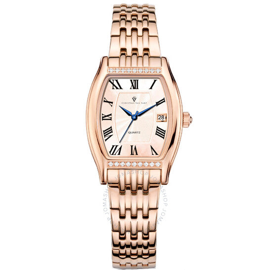علبة وسوار من الفولاذ المقاوم للصدأ بلون الذهب الوردي. إطار ثابت من الفولاذ المقاوم للصدأ بلون الذهب الوردي. ميناء بلون الذهب الوردي مع عقارب زرقاء وعلامات ساعات بأرقام رومانية. نوع الميناء: تناظري. عرض التاريخ عند موضع الساعة 3. آلية حركة كوارتز. زجاج معدني مقاوم للخدش. شكل العلبة مربع، مقاسها: 34 مم، سمكها: 10 مم. عرض السوار: 14 مم، طوله: 7.5 بوصة. مشبك قابل للطي مع قفل أمان. مقاومة للماء حتى عمق 3 أمتار / 10 أقدام. الوظائف: التاريخ، الساعة، الدقائق، الثواني. سلسلة جيما. ساعة أنيقة. ساعة كريستيان فان سانت جيما كوارتز نسائية بمينا ذهبي وردي CV2453.