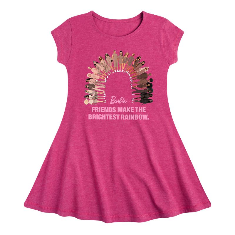 باربي - فستان "أصدقاء قوس قزح" - فستان مناسب للفتيات الصغيرات والشابات - انطلقي إلى عالم باربي الوردي الساحر مع ملابسنا المرخصة رسميًا والمُصممة برسومات جذابة لعاشقات الموضة! سواء كنتِ تحلمين بأن تصبحي مصممة أزياء، أو أميرة حورية بحر، أو مستكشفة عالمية، فإن ملابسنا تُضفي حيوية على عالم باربي بألوانها الزاهية وطبعاتها المرحة. مصنوعة من مواد عالية الجودة مع عناية فائقة بالتفاصيل، تضمن كل قطعة الراحة والمتانة للعب طوال اليوم. عبّري عن ذوقكِ الفريد وخيالكِ مع ملابس باربي المرسومة الحصرية!
