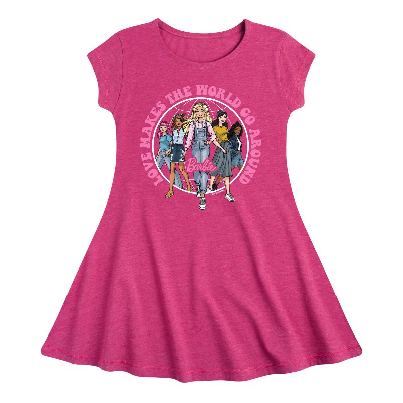 باربي - الحب يُحرك العالم - فستان مناسب للفتيات الصغيرات والشابات - انطلقي إلى عالم باربي الوردي الساحر مع ملابسنا الجرافيكية المرخصة رسميًا لعاشقات الموضة! سواء كنتِ تحلمين بأن تصبحي مصممة أزياء، أو أميرة حورية بحر، أو مستكشفة عالمية، فإن ملابسنا تُضفي حيوية على عالم باربي بألوانها الزاهية وطبعاتها المرحة. مصنوعة من مواد عالية الجودة مع عناية فائقة بالتفاصيل، تضمن كل قطعة الراحة والمتانة للعب طوال اليوم. عبّري عن ذوقكِ الفريد وخيالكِ مع ملابس باربي الجرافيكية الحصرية لدينا!