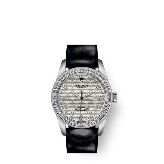 علبة من الفولاذ المقاوم للصدأ فضية اللون مع سوار جلدي أسود. إطار ثابت فضي اللون مرصع بالألماس. ميناء من قماش الجاكار الفضي مع عقارب فضية اللون وعلامات ساعات من الألماس. علامات دقائق حول الحافة الخارجية. نوع الميناء: تناظري. نافذة عرض التاريخ عند موضع الساعة الثالثة. حركة أوتوماتيكية من طراز تيودور كاليبر T201، مبنية على ETA 2671، تحتوي على 25 جوهرة، تنبض بمعدل 28800 ذبذبة في الساعة، ولديها احتياطي طاقة يدوم حوالي 38 ساعة. زجاج من الياقوت المقاوم للخدش. تاج لولبي. غطاء خلفي صلب. شكل العلبة دائري، مقاسها: 31 مم. مشبك قابل للطي مع مفتاح أمان. مقاومة للماء حتى عمق 100 متر / 330 قدمًا. الوظائف: التاريخ، الساعة، الدقيقة، الثانية. معلومات إضافية: إطار مزدوج من الفولاذ مرصع بـ 60 ماسة، بلمسة نهائية مصقولة. سلسلة Glamour Date. طراز ساعة فاخرة. علامة الساعة: صناعة سويسرية. تنوعات المنتج: M53020-0055. ساعة تيودور جلامور ديت أوتوماتيكية مرصعة بالألماس للسيدات 53020-0055.