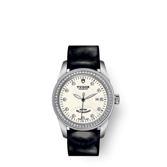 علبة من الفولاذ المقاوم للصدأ فضية اللون مع سوار جلدي أسود. إطار ثابت فضي اللون مرصع بالألماس. ميناء من الأوبالين بعقارب فضية اللون وعلامات ساعات من الألماس. علامات دقائق حول الحافة الخارجية. نوع الميناء: تناظري. نافذة عرض التاريخ عند موضع الساعة الثالثة. حركة أوتوماتيكية من طراز تيودور كاليبر T201، مبنية على ETA 2671، تحتوي على 25 جوهرة، تنبض بمعدل 28800 ذبذبة في الساعة، ولديها احتياطي طاقة لمدة 38 ساعة تقريبًا. زجاج من الياقوت المقاوم للخدش. تاج لولبي. غطاء خلفي صلب. شكل العلبة دائري، مقاسها: 31 مم. مشبك قابل للطي مع مفتاح أمان. مقاومة للماء حتى عمق 100 متر / 330 قدمًا. الوظائف: التاريخ، الساعة، الدقيقة، الثانية. معلومات إضافية: إطار مزدوج من الفولاذ مرصع بـ 60 ماسة، بلمسة نهائية مصقولة. سلسلة Glamour Date. طراز ساعة فاخرة. علامة الساعة: صناعة سويسرية. تنوعات المنتج: M53020-0086. ساعة تيودور جلامور ديت أوتوماتيكية مرصعة بالألماس للسيدات 53020-0086.