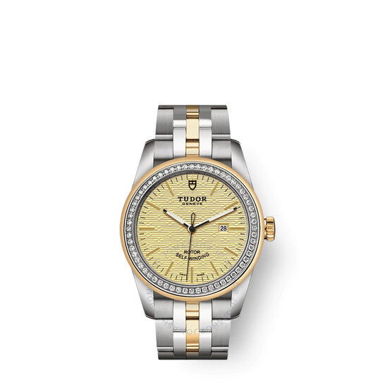علبة من الفولاذ المقاوم للصدأ فضية اللون مع سوار من الفولاذ المقاوم للصدأ ثنائي اللون (فضي وذهبي). إطار ذهبي ثابت مرصع بالألماس. ميناء بلون الشمبانيا من الجاكار مع عقارب وعلامات ساعات فضية اللون. علامات دقائق حول الحافة الخارجية. نوع الميناء: تناظري. عقارب مضيئة. عرض التاريخ عند موضع الساعة 3. حركة أوتوماتيكية من طراز Tudor Calibre T201، مبنية على ETA 2671، تحتوي على 25 جوهرة، تنبض بمعدل 28800 ذبذبة في الساعة، ولديها احتياطي طاقة لمدة 38 ساعة تقريبًا. زجاج من الياقوت المقاوم للخدش. تاج لولبي. غطاء خلفي صلب. شكل العلبة دائري، حجم العلبة: 31 مم. مشبك قابل للطي مع مفتاح أمان. مقاومة للماء حتى عمق 100 متر / 330 قدمًا. الوظائف: التاريخ، الساعة، الدقيقة، الثانية. معلومات إضافية: إطار مزدوج من الفولاذ والذهب الأصفر مرصع بـ 60 ماسة، بلمسة نهائية مصقولة. سلسلة Glamour Date. تصميم ساعة فاخرة. علامة الساعة: صناعة سويسرية. رقم الموديل: M53023-0022. ساعة تيودور غلامور ديت أوتوماتيكية نسائية مرصعة بالألماس رقم 53023-0022.