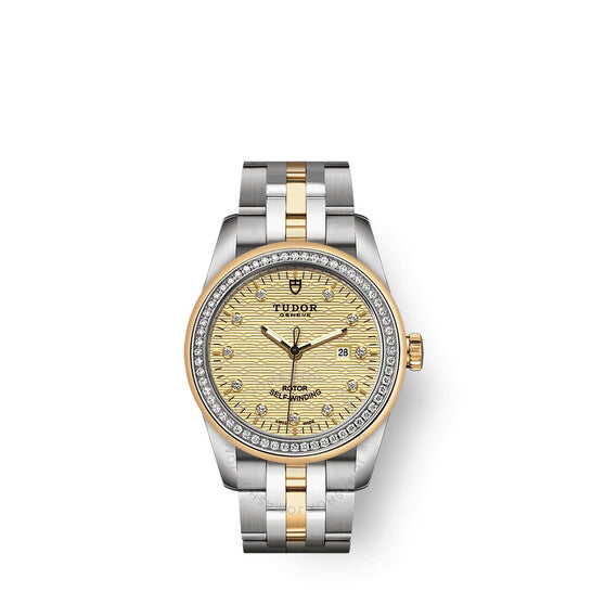 علبة من الفولاذ المقاوم للصدأ فضية اللون مع سوار من الفولاذ المقاوم للصدأ ثنائي اللون (فضي وذهبي). إطار ذهبي ثابت مرصع بالألماس. ميناء بلون الشمبانيا من الجاكار مع عقارب ذهبية اللون وعلامات ساعات. علامات دقائق حول الحافة الخارجية. نوع الميناء: تناظري. عقارب مضيئة. عرض التاريخ عند موضع الساعة 3. حركة أوتوماتيكية من طراز Tudor Calibre T201، مبنية على ETA 2671، تحتوي على 25 جوهرة، تنبض بمعدل 28800 ذبذبة في الساعة، ولديها احتياطي طاقة لمدة 38 ساعة تقريبًا. زجاج من الياقوت المقاوم للخدش. تاج لولبي. غطاء خلفي صلب. شكل دائري، حجم العلبة: 31 مم. مشبك قابل للطي مع مفتاح أمان. مقاومة للماء حتى عمق 100 متر / 330 قدمًا. الوظائف: التاريخ، الساعة، الدقيقة، الثانية. معلومات إضافية: إطار مزدوج من الفولاذ والذهب الأصفر مرصع بـ 60 ماسة، بلمسة نهائية مصقولة. سلسلة Glamour Date. طراز ساعة فاخرة. علامة الساعة: صناعة سويسرية. رقم الموديل: M53023-0023. ساعة تيودور غلامور ديت أوتوماتيكية نسائية مرصعة بالألماس رقم 53023-0023.