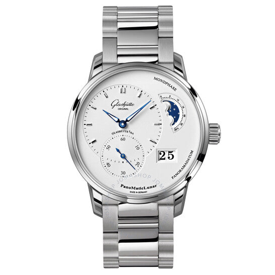 علبة فضية اللون من الفولاذ المقاوم للصدأ مع سوار مصقول ومصقول من الفولاذ المقاوم للصدأ. إطار ثابت فضي اللون. ميناء فضي بعقارب زرقاء وعلامات ساعات. نوع الميناء: تناظري. عقارب مضيئة. نافذة عرض التاريخ عند موضع الساعة الرابعة. ميناءان فرعيان يعرضان: الثواني الصغيرة وطور القمر. حركة أوتوماتيكية من غلاشوت كاليبر 90-02، تحتوي على 47 جوهرة، تنبض بتردد 28800 ذبذبة في الساعة، ولديها احتياطي طاقة يدوم حوالي 42 ساعة. زجاج ياقوت مقاوم للخدش. تاج قابل للسحب/الدفع. غطاء خلفي شفاف. شكل دائري، مقاس العلبة: 40 مم، سمكها: 12.7 مم. قابلة للطي بمشبك أمان. مقاومة للماء حتى عمق 50 مترًا / 165 قدمًا. الوظائف: طور القمر، تاريخ كبير، ساعات، دقائق، ثواني صغيرة. سلسلة بانوماتيك لونار. تصميم ساعة فاخرة. ملصق الساعة: صنع في ألمانيا. ساعة جلاشوت بانوماتيك لونار أوتوماتيكية للرجال بمينا فضي 1-90-02-42-32-24.