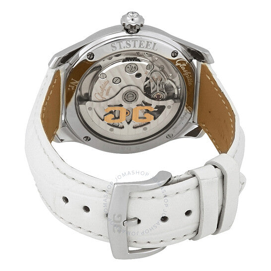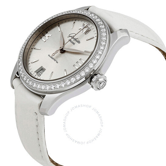 علبة من الفولاذ المقاوم للصدأ مع حزام من جلد التمساح بيج. إطار ثابت من الفولاذ المقاوم للصدأ مرصع بالألماس. ميناء فضي بعقارب فضية اللون وعلامات ساعات. أرقام رومانية تُشير إلى الساعات 3 و9 و12. علامات دقائق حول الحافة الخارجية. نوع الميناء: تناظري. عرض التاريخ عند الساعة 6. حركة أوتوماتيكية من غلاشوت، عيار 39-22، مع احتياطي طاقة لمدة 40 ساعة. زجاج ياقوت مقاوم للخدش. تاج قابل للسحب/الدفع. غطاء خلفي شفاف. شكل دائري. حجم العلبة: 36 مم. سمكها: 10.2 مم. مشبك تانغ. مقاومة للماء حتى عمق 50 مترًا / 165 قدمًا. الوظائف: التاريخ، الساعة، الدقيقة، الثانية. تصميم ساعة فاخر. ملصق الساعة: صنع في ألمانيا. ساعة غلاشوت سيريناد النسائية بمينا فضي، 39-22-02-22-44.