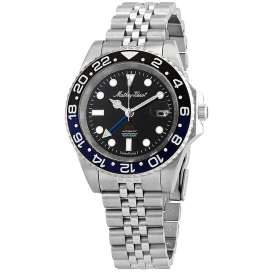 علبة من الفولاذ 316L مع سوار من الفولاذ 316L. إطار دوار أحادي الاتجاه من الفولاذ 316L مع حلقة مرصعة باللونين الأسود والأزرق تُظهر علامات 24 ساعة (توقيت غرينتش). ميناء أسود بعقارب فضية مضيئة وعلامات ساعات منقطة. علامات دقائق حول الحافة الخارجية. نوع الميناء: تناظري. عقارب وعلامات مضيئة. عرض التاريخ عند موضع الساعة 3. حركة أوتوماتيكية P293. كريستال ياقوتي مقاوم للخدش. تاج لولبي. غطاء خلفي صلب. شكل العلبة دائري، مقاس العلبة: 42 مم، سمكها: 8.55 مم. مشبك قابل للطي بزر ضغط. مقاومة للماء حتى عمق 100 متر / 330 قدم. الوظائف: التاريخ، توقيت غرينتش، منطقة زمنية ثانية، الساعة، الدقيقة، الثانية. تصميم ساعة كاجوال. علامة الساعة: صناعة سويسرية. ساعة ماثي تيسوت جي إم تي أوتوماتيكية بإطار باتمان للرجال H903ATNB.