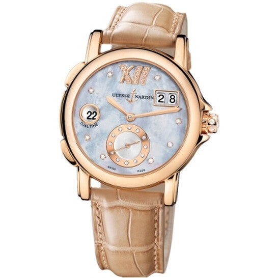 علبة من الذهب الوردي عيار 18 قيراطًا، مع حزام من جلد التمساح بلون بيج. إطار ثابت. ميناء رمادي من عرق اللؤلؤ، بعقارب من الذهب الوردي، وأرقام رومانية مرصعة بالألماس عند علامات الساعة 12. نوع الميناء: تناظري. نافذة التاريخ عند الساعة 2. موانئ فرعية للثواني الصغيرة. حركة أوتوماتيكية باحتياطي طاقة لمدة 42 ساعة. زجاج ياقوت مقاوم للخدش. غطاء خلفي شفاف. شكل دائري. حجم العلبة: 37 مم. مشبك قابل للطي. مقاومة للماء حتى عمق 100 متر / 330 قدمًا. الوظائف: التاريخ، الساعة، الدقيقة، الثانية، المنطقة الزمنية الثانية. تصميم ساعة فاخرة. علامة الساعة: صناعة سويسرية. ساعة أوليس ناردين جي إم تي بيغ ديت أوتوماتيكية نسائية 246-22/392.