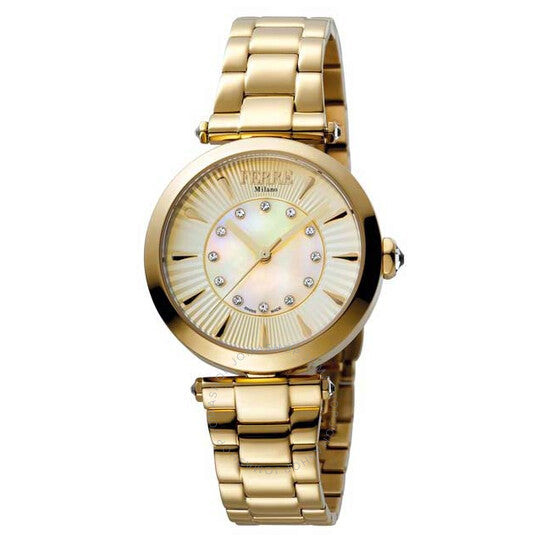 علبة وسوار من الفولاذ المقاوم للصدأ ذهبي اللون. إطار ذهبي ثابت. ميناء ذهبي (من عرق اللؤلؤ) مع عقارب ذهبية اللون ومؤشرات ساعات من الكريستال. نوع الميناء: تناظري. حركة كوارتز. كريستال معدني مقاوم للخدش. تاج قابل للسحب والدفع. غطاء خلفي صلب. شكل دائري. حجم العلبة: 32 مم. سمكها: 8.3 مم. عرض السوار: 14 مم. طول السوار: 7.5 بوصة. مشبك قابل للطي. مقاومة للماء حتى عمق 50 مترًا / 165 قدمًا. الوظائف: الساعات، الدقائق، الثواني. تصميم كاجوال. علامة الساعة: صناعة سويسرية. ساعة فيري ميلانو نسائية بمينا ذهبي، لون ذهبي، FM1L075M0021.