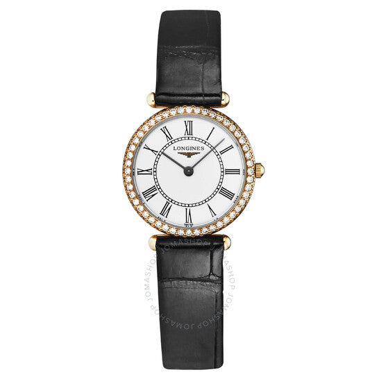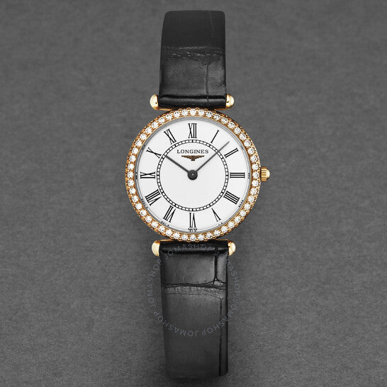 علبة من الذهب الوردي عيار ١٨ قيراطًا مع سوار جلدي أسود. إطار ثابت. ميناء أبيض بعقارب سوداء وعلامات ساعات بأرقام رومانية. نوع الميناء: تناظري. حركة كوارتز لونجين كاليبر L209. زجاج ياقوت مقاوم للخدش. غطاء خلفي صلب. شكل دائري، مقاس العلبة: ٢٤.٥ مم، سمكها: ٥ مم. مشبك بإبزيم. مقاومة للماء حتى عمق ٣٠ مترًا / ١٠٠ قدم. الوظائف: الساعة، الدقائق. سلسلة جراند كلاسيك. طراز ساعة رسمية. علامة الساعة: صناعة سويسرية. إصدارات متنوعة: L4 191 9 11 0، L4-191-9-11-0، L4/191/9/11/0، L41919110. ساعة لونجين جراند كلاسيك كوارتز نسائية بمينا أبيض L4.191.9.11.0.