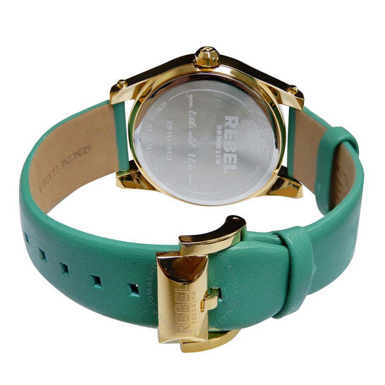 علبة من الفولاذ المقاوم للصدأ بلون ذهبي مع حزام جلدي بلون أزرق مخضر. إطار ثابت من الفولاذ المقاوم للصدأ بلون ذهبي مخضر. ميناء بلون أزرق مخضر مع عقارب ذهبية اللون وأرقام عربية وعلامات ساعات. نوع الميناء: تناظري. حركة كوارتز. زجاج معدني مقاوم للخدش مع كريستال مطلي بالياقوت. تاج ضغط/سحب. غطاء خلفي صلب. شكل دائري، مقاس العلبة: 40 مم، سمكها: 12 مم. عرض السوار: 20 مم، طوله: 7.5 بوصة. مشبك تانغ. مقاومة للماء حتى عمق 50 مترًا / 165 قدمًا. الوظائف: الساعات، الدقائق، الثواني. تصميم كاجوال. ساعة ريبل غريفزند النسائية RB111-9121.