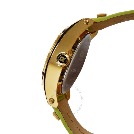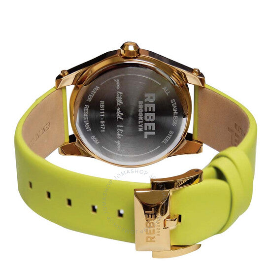 علبة من الفولاذ المقاوم للصدأ بلون ذهبي مع حزام جلدي أخضر ليموني. إطار ثابت من الفولاذ المقاوم للصدأ بلون ذهبي. ميناء أخضر ليموني مع عقارب ذهبية اللون وأرقام عربية وعلامات ساعات. نوع الميناء: تناظري. حركة كوارتز. زجاج معدني مقاوم للخدش مع كريستال مطلي بالياقوت. تاج ضغط/سحب. غطاء خلفي صلب. شكل دائري، مقاس العلبة: 40 مم، سمكها: 12 مم. عرض السوار: 20 مم، طوله: 7.5 بوصة. مشبك تانغ. مقاومة للماء حتى عمق 50 مترًا / 165 قدمًا. الوظائف: الساعات، الدقائق، الثواني. تصميم كاجوال. ساعة ريبيل غريفزند النسائية RB111-9171.
