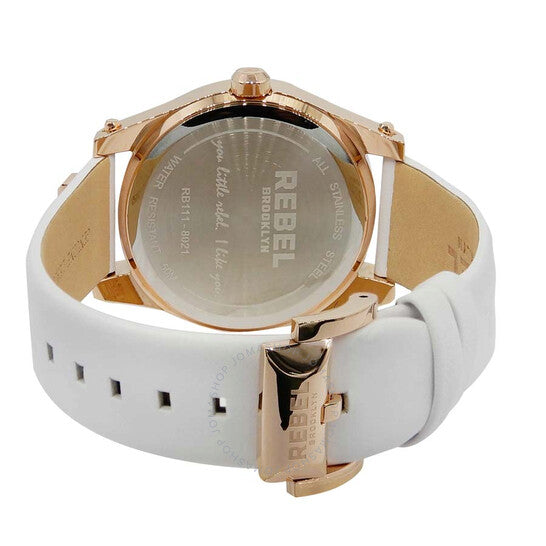 علبة من الفولاذ المقاوم للصدأ بلون الذهب الوردي مع سوار جلدي أبيض. إطار ثابت من الفولاذ المقاوم للصدأ بلون الذهب الوردي. ميناء أبيض بعقارب بلون الذهب الوردي وأرقام عربية وعلامات ساعات. نوع الميناء: تناظري. حركة كوارتز. زجاج معدني مقاوم للخدش مع كريستال مطلي بالياقوت. تاج ضغط/سحب. غطاء خلفي صلب. شكل دائري، مقاس العلبة: 40 مم، سمكها: 12 مم. عرض السوار: 20 مم، طوله: 7.5 بوصة. مشبك تانغ. مقاومة للماء حتى عمق 50 مترًا / 165 قدمًا. الوظائف: الساعات، الدقائق، الثواني. تصميم كاجوال. ساعة ريبيل غريفزند النسائية بمينا بيضاء RB111-8021.