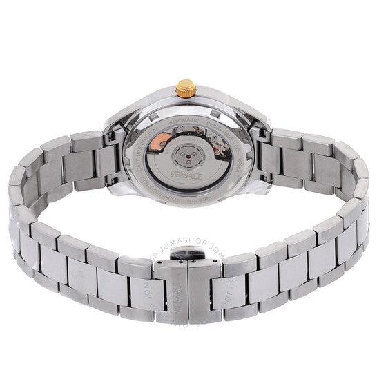 علبة وسوار من الفولاذ المقاوم للصدأ فضي اللون. إطار ثابت من الفولاذ المقاوم للصدأ فضي اللون. ميناء أزرق مع عقارب ذهبية اللون وعلامات ساعات. نوع الميناء: تناظري. عرض التاريخ عند موضع الساعة 3. حركة أوتوماتيكية. زجاج ياقوت مقاوم للخدش. تاج قابل للسحب/الدفع. غطاء خلفي صلب. شكل العلبة دائري، مقاسها: 35 مم، سمكها: 10 مم. عرض السوار: 16 مم. مشبك قابل للطي بزر ضغط. مقاومة للماء حتى عمق 50 مترًا / 165 قدمًا. الوظائف: التاريخ، الساعة، الدقائق، الثانية. سلسلة Greca Classic. تصميم ساعة كاجوال. علامة الساعة: صناعة سويسرية. ساعة Versace Greca Classic أوتوماتيكية نسائية بمينا أزرق VESCA0224.