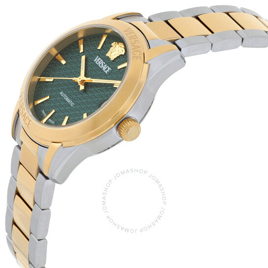 علبة فضية اللون من الفولاذ المقاوم للصدأ مع سوار ثنائي اللون (فضي وذهبي). إطار ثابت من الفولاذ المقاوم للصدأ ذهبي اللون. ميناء أخضر بعقارب ذهبية اللون وعلامات ساعات. نوع الميناء: تناظري. عرض التاريخ عند موضع الساعة 3. آلية حركة أوتوماتيكية. زجاج ياقوت مقاوم للخدش. تاج قابل للسحب/الدفع. غطاء خلفي صلب. شكل دائري، مقاس العلبة: 35 مم، سمكها: 10 مم. عرض السوار: 16 مم. مشبك قابل للطي بزر ضغط. مقاومة للماء حتى عمق 50 مترًا / 165 قدمًا. الوظائف: التاريخ، الساعة، الدقيقة، الثانية. سلسلة Greca Classic. تصميم كاجوال. علامة الساعة: صناعة سويسرية. ساعة Versace Greca Classic أوتوماتيكية نسائية بمينا أخضر VESCA0524.