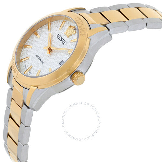 علبة فضية اللون من الفولاذ المقاوم للصدأ مع سوار ثنائي اللون (فضي وذهبي). إطار ثابت من الفولاذ المقاوم للصدأ ذهبي اللون. ميناء فضي اللون مع عقارب ذهبية اللون وعلامات ساعات. نوع الميناء: تناظري. عرض التاريخ عند موضع الساعة 3. آلية حركة أوتوماتيكية. زجاج ياقوت مقاوم للخدش. تاج قابل للسحب/الدفع. غطاء خلفي صلب. شكل دائري، مقاس العلبة: 35 مم، سمكها: 10 مم. عرض السوار: 16 مم. مشبك قابل للطي بزر ضغط. مقاومة للماء حتى عمق 50 مترًا / 165 قدمًا. الوظائف: التاريخ، الساعة، الدقيقة، الثانية. سلسلة Greca Classic. تصميم كاجوال. علامة الساعة: صناعة سويسرية. ساعة Versace Greca Classic أوتوماتيكية نسائية بمينا فضي VESCA0424.