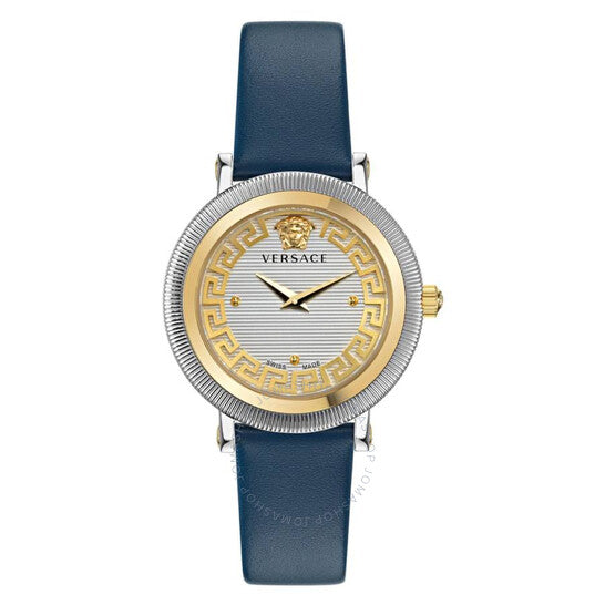 علبة من الفولاذ المقاوم للصدأ فضية اللون مع سوار جلدي أزرق. إطار ثابت من الفولاذ المقاوم للصدأ فضي اللون. ميناء فضي مع عقارب ذهبية اللون وعلامات ساعات منقطة. مزين برأس ميدوسا ثلاثي الأبعاد عند موضع الساعة ١٢. نوع الميناء: تناظري. حركة كوارتز. زجاج ياقوت مقاوم للخدش. تاج قابل للسحب/الدفع. غطاء خلفي صلب. شكل دائري، مقاس العلبة: ٣٥ مم، سمكها: ٨ مم. عرض السوار: ٢٢ مم. مشبك تانغ. مقاومة للماء حتى عمق ٥٠ مترًا / ١٦٥ قدمًا. الوظائف: الساعات، الدقائق. سلسلة Greca Flourish. طراز ساعة رسمية. علامة الساعة: صناعة سويسرية. ساعة Versace Greca Flourish كوارتز نسائية بمينا فضية VE7F00223.