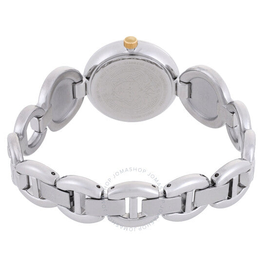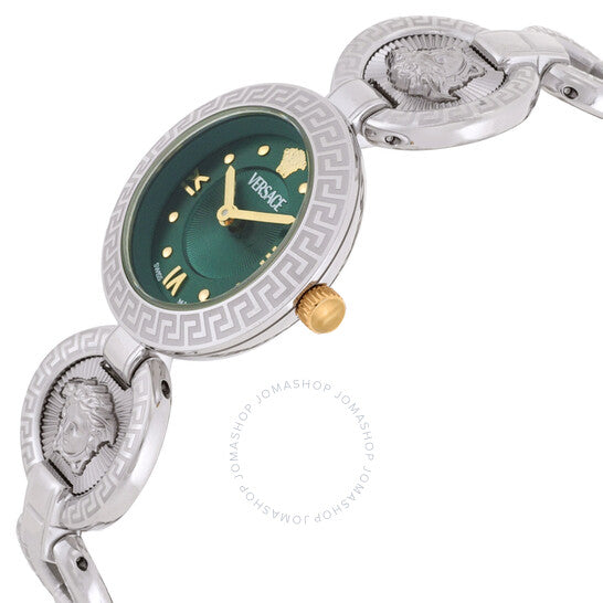 علبة وسوار من الفولاذ المقاوم للصدأ فضي اللون. إطار ثابت من الفولاذ المقاوم للصدأ فضي اللون. ميناء أخضر مع عقارب ذهبية اللون ومؤشرات ساعات بأرقام رومانية. نوع الميناء: تناظري. حركة كوارتز. زجاج ياقوت مقاوم للخدش. تاج قابل للسحب/الدفع. غطاء خلفي صلب. شكل دائري، مقاس العلبة: ٢٨ مم. مشبك مجوهرات. مقاومة للماء حتى عمق ٥٠ مترًا / ١٦٥ قدمًا. الوظائف: الساعات، الدقائق. سلسلة Greca Jewel. تصميم كاجوال. علامة الساعة: صناعة سويسرية. ساعة Versace Greca Jewel كوارتز نسائية بمينا أخضر VEWCA0224.