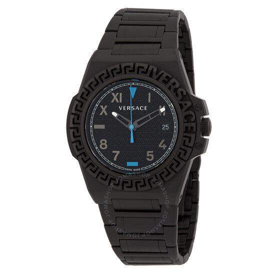 علبة وسوار من الفولاذ المقاوم للصدأ IP أسودان. إطار ثابت من الفولاذ المقاوم للصدأ IP أسود. ميناء أسود بعقارب سوداء وعلامات ساعات بالأرقام العربية والرومانية. علامات دقائق حول الحافة الخارجية. نوع الميناء: تناظري. عرض التاريخ عند موضع الساعة 3. آلية حركة كوارتز. زجاج ياقوتي مقاوم للخدش. تاج قابل للسحب/الدفع. غطاء خلفي صلب. شكل العلبة دائري، مقاسها: 44 مم. إبزيم قابل للطي بزر ضغط. مقاومة للماء حتى عمق 50 مترًا / 165 قدمًا. الوظائف: التاريخ، الساعة، الدقائق، الثواني. سلسلة Greca Reaction. تصميم ساعة كاجوال. علامة الساعة: صناعة سويسرية. ساعة Versace Greca Reaction كوارتز سوداء للرجال بمينا VE3I00622.